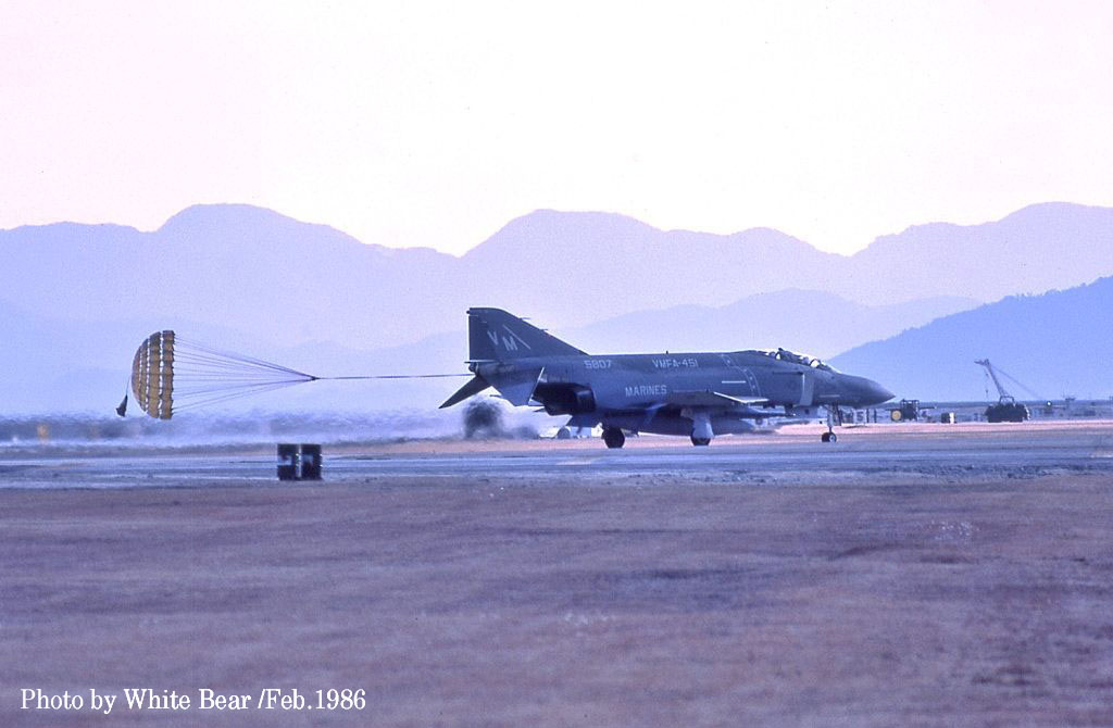 ↑ 1984年横田基地R/W-36に着陸するVMFA-451のF-4S/VM-08。最初に撮影した時にはテールコードも読み取れず、どの部隊かも判別できなかったが、2機目で尾翼の"VM"が読み取れ、以前のマーキングと比較して愕然とした。