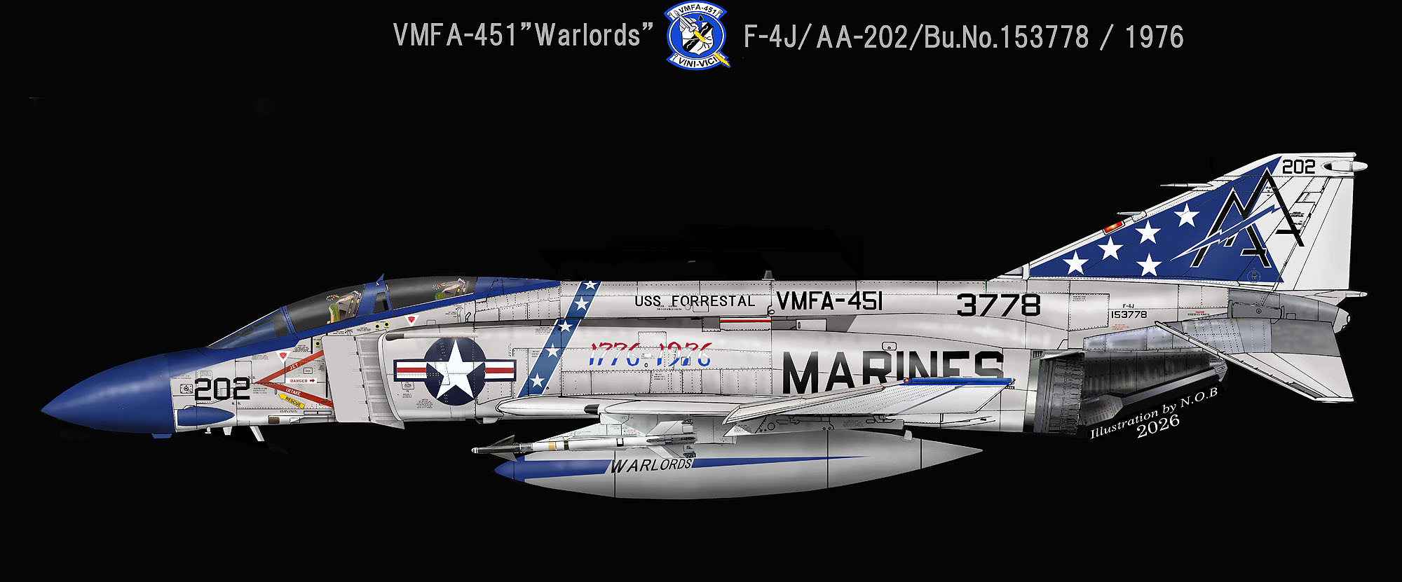 1970年代初めだっただろうか、定期購読していた航空雑誌のグラビアページにVMFA-451のF-4Jファントムの写真が掲載された。尾翼は白とマリーンブルー2色で”VM”のレターを美しく塗り分けた、それは見事なデザインでその美しい尾翼の機体に思わず心を奪われた。アメリカ東海岸の海兵隊航空基地ビューフォートをホームベースとしていた部隊だったので、その後岩国基地に派遣され目の前に現れるとは想像もしなかった。